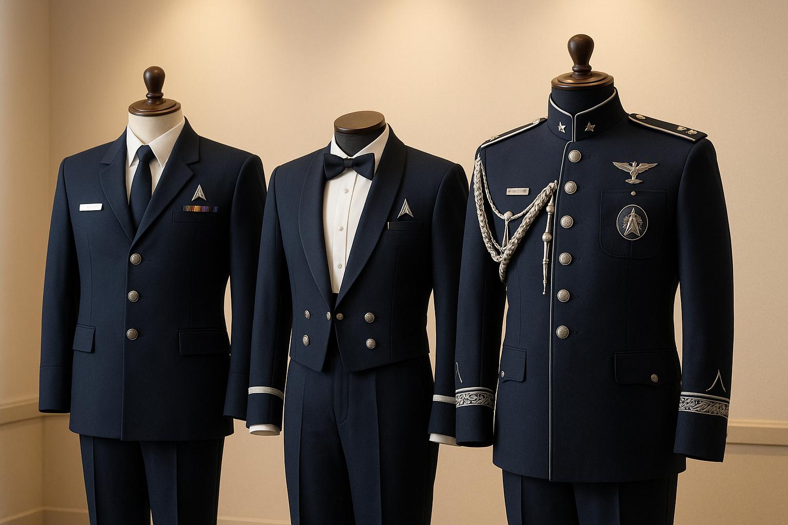 Overview of Space Force dress uniforms: service coat design and rollout, mess dress updates, ceremonial attire, insignia rules, and grooming standards.